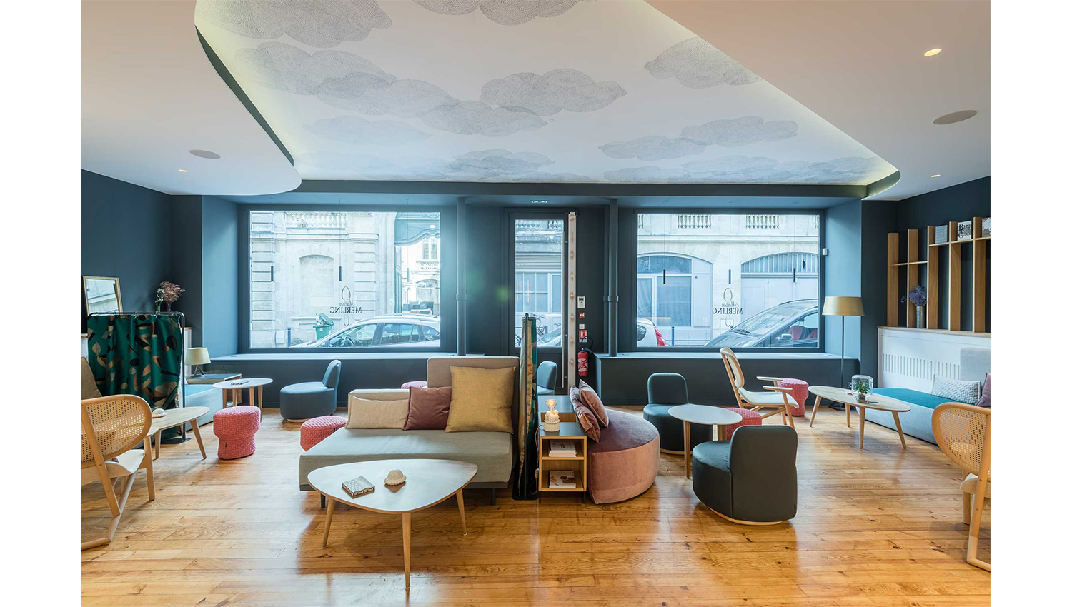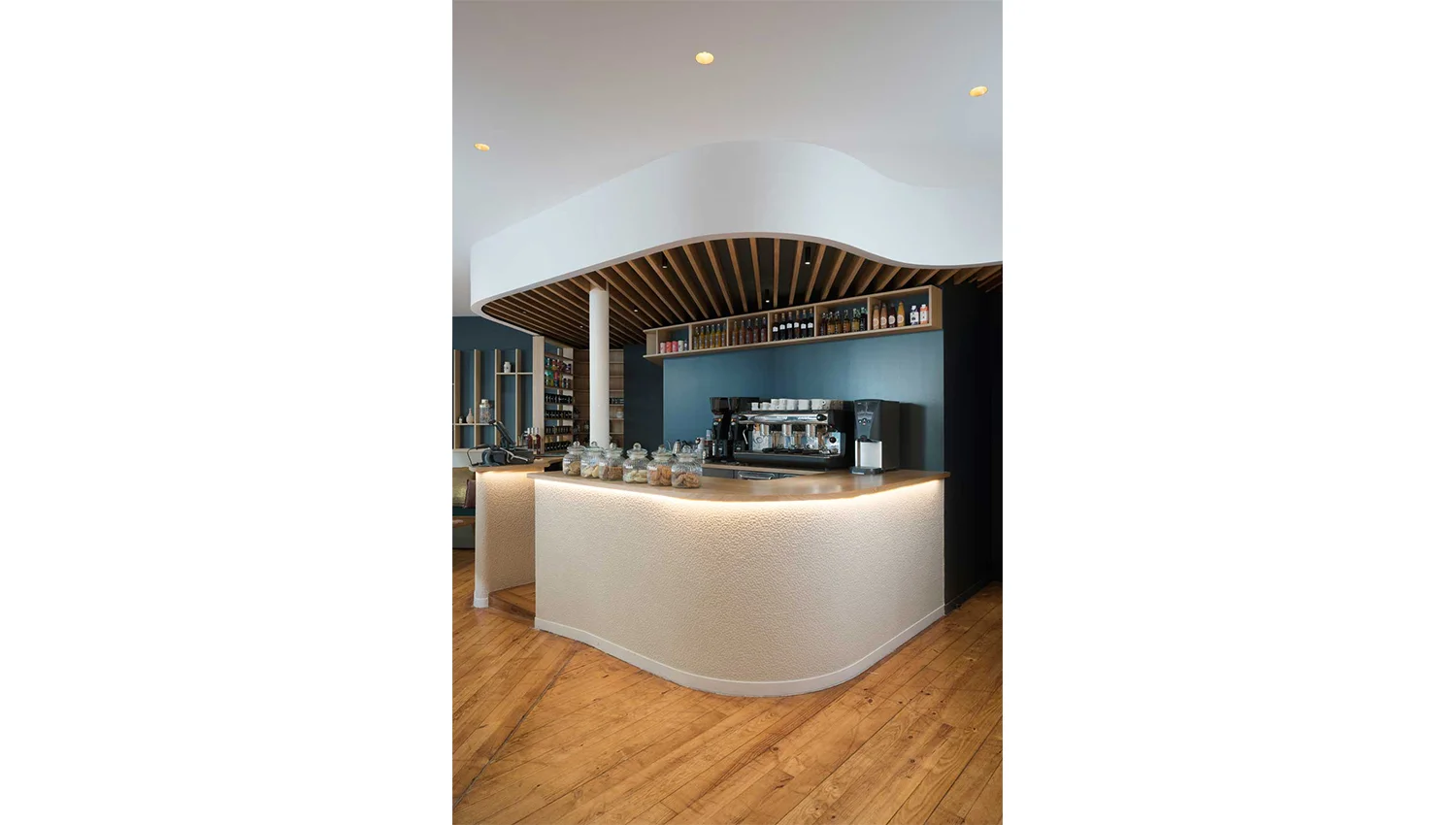 Les espaces sont structurés et mis en valeurs par des jeux de matériaux et de volumes en courbes au sol et au plafond. Ils confèrent au lieu avec le choix d’une présence abondante du bois, un caractère cosy et accueillant. La mise en scène est soignée, les îlots de présentation reprennent la forme organique du grain de café. Ce travail servira d’écrin pour les futures boutiques de la Maison Merling.